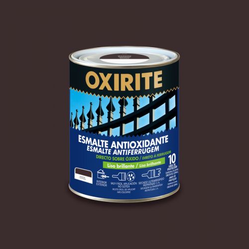 La mayoría de los metales tienden a oxidarse especialmente si se encuentran directamente expuestos a la intemperie. Por tanto, requieren de tratamientos especiales para ser protegidos de manera duradera. Con Oxirite 10 es un esmalte antioxidante de aplicación directa sobre las superficies de hierro o acero, ya sean nuevas u oxidadas, sin necesidad de utilizar ninguna imprimación previa, para la protección de metales. De acabado liso brillante, proporciona una excelente protección contra la corrosión ya sea para interior o exterior. Es eficaz incluso directamente sobre superficies oxidadas, con solo eliminar las partículas sueltas de óxido. Muy fácil de aplicar. Es tixotrópico y no gotea. La nivelación y la cubrición son excelentes. Seca rápidamente, de manera que cada mano se puede aplicar pasada 1 hora de la anterior. Es importante planificar el pintado de forma que entre dos manos no pasen más de 8 horas. Después de 8 horas, empieza el curado de Oxirite, que dura 2 semanas. Mientras dure el curado, no debe aplicarse más pintura, pues no se formaría correctamente la capa protectora. Aplicación a brocha, pincel, rodillo de pelo corto y pistola. Alta resistencia a los rayos UV, la intemperie y la corrosión. Contiene aditivos HALS e inhibidores de corrosión. Disponible en colores blanco, negro, gris plata, gris perla, verde, verde musgo, verde oscuro, azul, rojo, rojo carruajes, marrón, amarillo y magnolia.