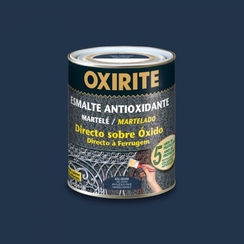 Oxirite 5 años Martelé es un esmalte antioxidante de aplicación directa sobre las superficies de hierro o acero, ya sean nuevas u oxidadas, sin necesidad de utilizar ninguna imprimación previa. Proporciona una excelente protección contra la corrosión y un atractivo acabado martelé. Para interior o exterior. Muy fácil de aplicar. Es tixotrópico y no gotea. La nivelación y la cubrición son excelentes. Gran dureza y resistencia a los golpes y a la abrasión. Sin plomo ni cromatos. Secado al tacto 60 minutos. Rendimiento aproximado de 4,5 m²/L según la superficie y el método de aplicación ya sea a brocha, rodillo de pelo corto y pistola. Limpieza de utensilios con disolventes. Colores disponibles en blanco, negro, gris, gris plata, verde medio, verde oscuro, azul oscuro, rojo, marrón, dorado, bronce y cobre.