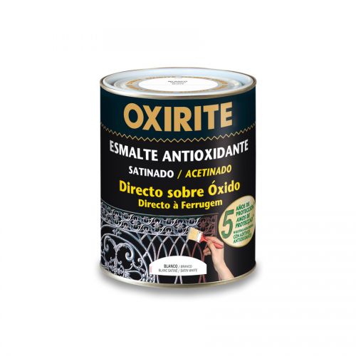 Oxirite 5 años Satinado es un esmalte antioxidante de aplicación directa sobre las superficies de hierro o acero, ya sean nuevas u oxidadas, sin necesidad de utilizar ninguna imprimación previa. Proporciona una excelente protección contra la corrosión y un atractivo acabado satinado. Para interior o exterior. Muy fácil de aplicar. Es tixotrópico y no gotea. La nivelación y la cubrición son excelentes. Gran dureza y resistencia a los golpes y a la abrasión. Sin plomo ni cromatos. Secado al tacto 60 minutos. Rendimiento aproximado de 4,5 m²/L según la superficie y el método de aplicación ya sea a brocha, rodillo de pelo corto y pistola. Limpieza de utensilios con disolventes. Colores disponibles en blanco, negro, gris plata, gris perla, verde, verde musgo, azul, rojo, rojo carruajes, marrón, amarillo y magnolia.