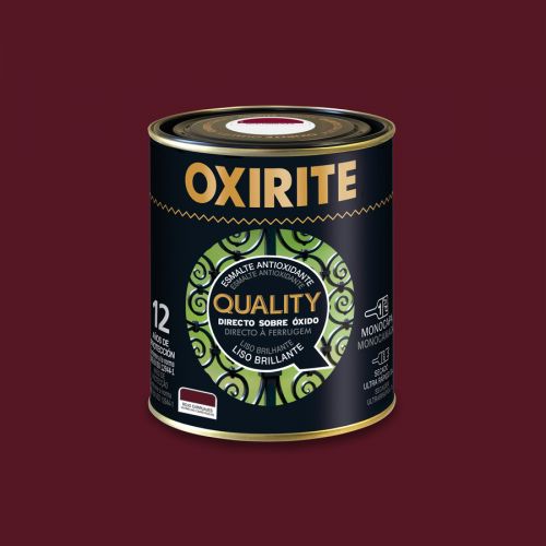 Oxirite Quality Liso Brillante con 12 de años de protección, es un esmalte antioxidante directa sobre las superficies de hierro o acero, ya sean nuevas y oxidadas, sin necesidad de utilizar ninguna imprimación previa. Proporciona una excelente protección contra la corrosión y un atractivo acabado liso de alto brillo. Puede ser usado para interior o exterior. Se puede aplicar sobre superficies oxidadas, eliminado previamente las partículas sueltas. Fácil de aplicar, sin diluir. No gotea. En la mayoría de los casos con una única mano se obtiene la cubrición necesaria. Por su aspecto tixotrópico (cremoso, tipo gel) se puede dejar una capa gruesa sin descuelgues. Secado ultra rápido a partir de 1 hora y repintado en 1 hora. Rendimiento de 6m²/L. El producto puede ser aplicado a brocha, pincel, pistola y rodillo de pelo corto. Limpieza de útiles con disolvente Oxirite. Disponible en colores blanco, marrón, verde musgo, negro, gris plata y rojo carruajes.