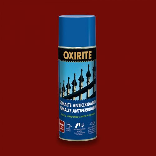 Oxirite Spray Metalizado es un esmalte antioxidante de aplicación directa sobre las superficies de hierro o acero, ya sean nuevas u oxidadas, sin necesidad de utilizar ninguna imprimación previa. Proporciona una excelente protección contra la corrosión y un atractivo acabado metalizado. Para interior o exterior. Es tixotrópico y no gotea. La nivelación y la cubrición son excelentes. Gran dureza y resistencia a los golpes y a la abrasión. Sin plomo ni cromatos. Muy fácil de aplicar en su presentación en aerosol, con el envase en posición vertical, a una distancia de 20 cm del metal. Secado entre 15-20 minutos. Rendimiento 2m² para 400 mL. Colores disponibles en gris oscuro, gris plata, cobre, azul oscuro, verde oscuro y rojo.