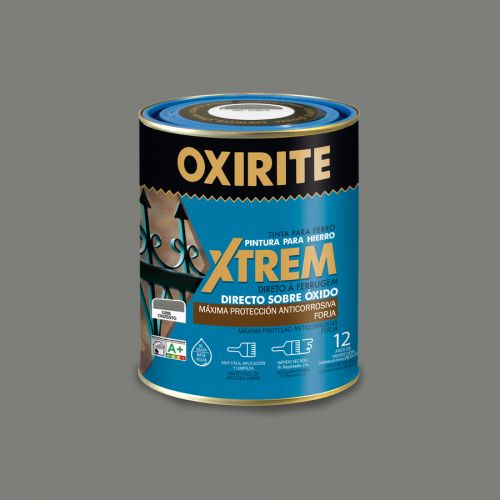 Oxirite Xtrem 12 años Forja protege superficies metálicas dando un acabado forja en diversos colores. De muy fácil aplicación directa sobre el metal, no requiere de imprimación previa y está garantizado para metales férreos y no férreos (acero galvanizado y aluminio). Incorpora materias primas especiales como una resina acrílica hidrofóbica de nueva generación, que le confiere una alta resistencia a la corrosión, la humedad y el agua. Fácil aplicación a brocha, pincel o rodillo de pelo corto. A pistola se puede diluir con agua hasta un 20%. No gotea, los útiles se limpian con agua. Tiene un rendimiento de 8 - 10 m²/L y a mano unos 4-5 m². Rápido secado en 1 hora (repintado en 2 horas aproximadamente). Disponible en negro, gris y verde.