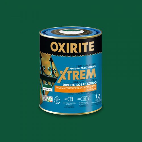 Oxirite Xtrem 12 años Satinado protege superficies metálicas dando un acabado satinado en diversos colores. De muy fácil aplicación directa sobre el metal, no requiere de imprimación previa y está garantizado para metales férreos y no férreos (acero galvanizado y aluminio). Incorpora materias primas especiales como una resina acrílica hidrofóbica de nueva generación, que le confiere una alta resistencia a la corrosión, la humedad y el agua. Fácil aplicación a brocha, pincel o rodillo de pelo corto. A pistola se puede diluir con agua hasta un 20%. No gotea, los útiles se limpian con agua. Tiene un rendimiento de 8 - 10 m²/L y a mano unos 4-5 m². Rápido secado en 1 hora (repintado en 2 horas aproximadamente). Disponible en blanco, negro, gris, verde musgo, verde oscuro, rojo carruajes y marrón.