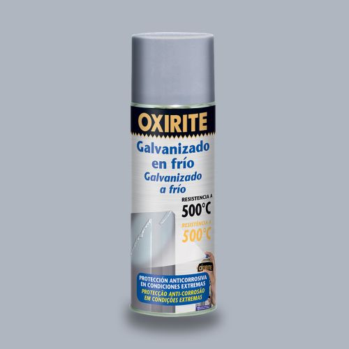 Oxirite Galvanizado en Frío Spray es una imprimación galvánica anticorrosiva formulada con resinas de alta calidad y polvo de zinc esférico micronizado que aporta un aspecto metalizado galvánico. Para proteger las superficies de hierro y acero incluso oxidadas. Muy eficaz en condiciones extremas, tanto en interior como en exterior. Especialmente indicada para retoques de desperfectos, uniones de soldaduras, vallas y estructuras metálicas. Excelente poder anticorrosivo. Resistente a 500°C. Facilidad de aplicación y repintado. Rendimiento teórico del envase 2 m². Rápido secado al tacto 10 minutos. Gran durabilidad de brillo. Color disponible en gris.