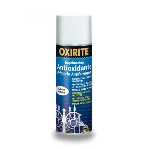 Oxirite Imprimación Antioxidante Spray es una imprimación y fondo protector de aplicación previa al pintado de una superficie de hierro o acero, para una total protección contra el óxido. Contiene pigmentos inhibidores de la corrosión en resinas acrílicas. Elevada resistencia a la intemperie. Fácil aplicación y alto poder cubriente con un rendimiento teórico del envase 2 m². Rápido secado y repintado en 30 minutos. Colores y acabados en blanco.