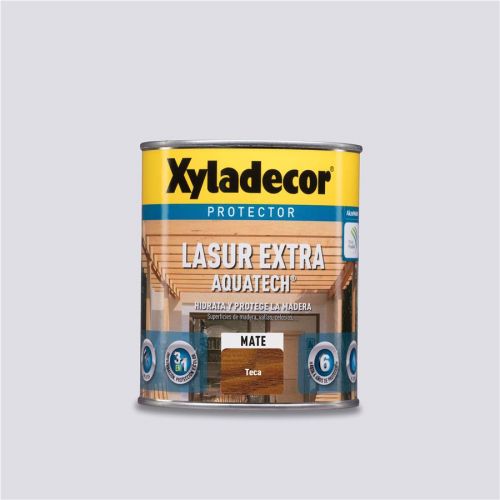 Xyladecor Lasur Extra Mate Aquatech es un protector o lasur para madera exterior en base agua. Protege y realza las vetas de la madera natural. Es un producto poro abierto, de acabado mate, que ofrece protección duradera de hasta 6 años frente al sol y lluvia. Recomendado para vallas, pérgolas y celosías. Acabado perfecto y natural, sin olor de fácil aplicación. Secado al tacto 4h, segunda capa 5h. Rendimiento hasta 16m²/litro por capa, en superficies lisas con una porosidad media.