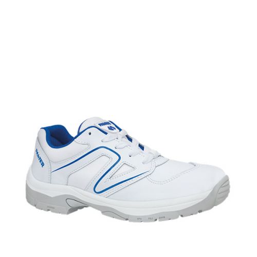 Calzado de seguridad tipo deportivo, color blanco, con cordones, cómodo, ligero y resistente. Calzado antifatiga, para profesionales que pasan mucho tiempo de pie.