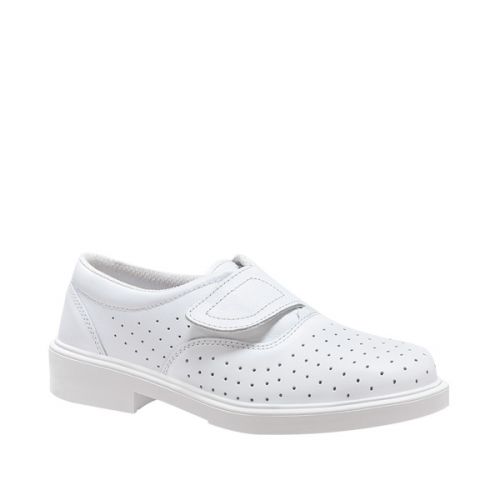 Calzado laboral en color blanco y corte en piel 1ª flor natural muy suave. Incorpora perforaciones en el empeine que favorecen la aireación del pie. Está especialmente indicado para clínicas, limpieza, laboratorios, sanitarios, etc.