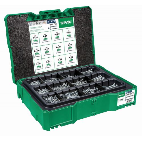 SPAX Box systainer T-Loc I, Kit de tornillos con 12 dimensiones, Cabeza plana, T-STAR plus, 4CUT, WIROX