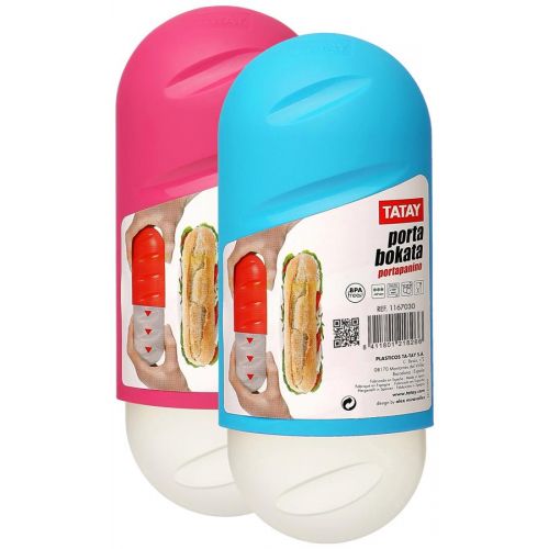 Portabocadillo en plástico, ajustable hasta un maximo de 24 cm, fabricado en PP, libre de BpA, higiènico, una parte translucida y otra opaca. Protege el bocadillo, y evita consumo aluminio y film plástico