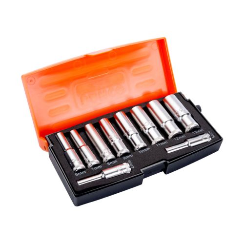 Juego de vasos serie larga con cuadradillo de 1/4\" y perfil bi-hexagonal métrico (10 unidades)
