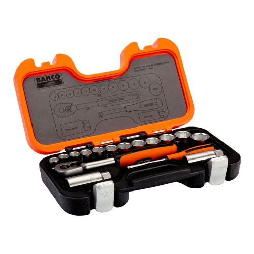 Juego de vasos de 1/4\" y 3/8\" con perfil hexagonal métrico y carraca (34 piezas/maletín)