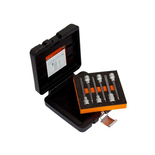6 puntas con la medidas M5, M6, M8, M10, M12 y M14│ Longitud: 140 mm │Puntas de acero S2 con acabado de cinc fosfatado y mate │ Vasos de acero de cromo vanadio (CrV) con acabado cromado mate │ │Se suministra en una caja moldeada por soplado, con una bandeja de foam para un mejor control de las herramientas