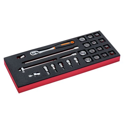 Juego de carraca de cabeza tipo pera y vasos de 3/8\" en bandeja de foam 1/3 Fit&Go (25 piezas)