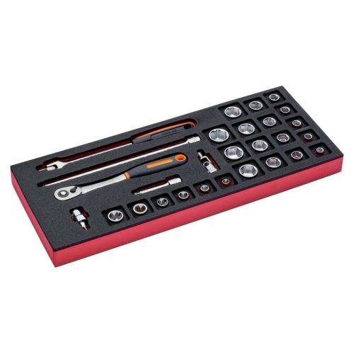 Juego de carraca de cabeza tipo pera y vasos de 3/8\" en bandeja de foam 1/3 Fit&Go (28 piezas)