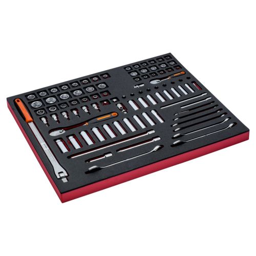 Juego de llaves combinadas y vasos de 1/4\" + 3/8\" en bandeja de foam 3/3 Fit&Go (91 piezas)