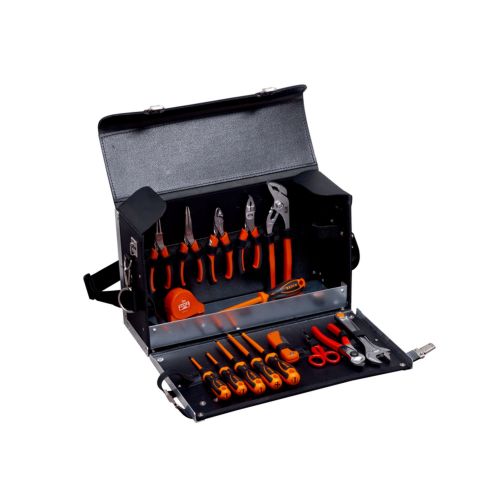 El juego incluye 16 piezas de herramientas para electricistas en una bolsa de cuero