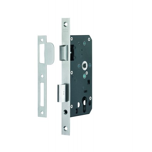 Cerradura con resbalón y palanca en acero inoxidable. Frente atornillado AISI 304. Medida centros normalizada 72 mm. Resbalón reversible accionado por manilla y cilindro. Palanca accionada por cilindro. Cerradero 24 mm
