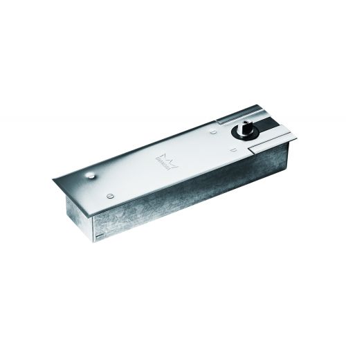 Conjunto BTS 75V para puertas de vaivén, compuesto por: placa de acero inoxidable, brazo inferior art. 8021, perno superior art. 8062 y eje normal. Con fijación a 90 grados.